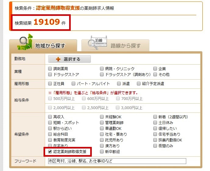 転職サイトの「ファルマスタッフ」では、「認定薬剤師取得支援あり求人」で検索も可能です。「認定薬剤師取得支援あり求人」にチェックを入れ検索すると1万9000件の求人がヒットしました!